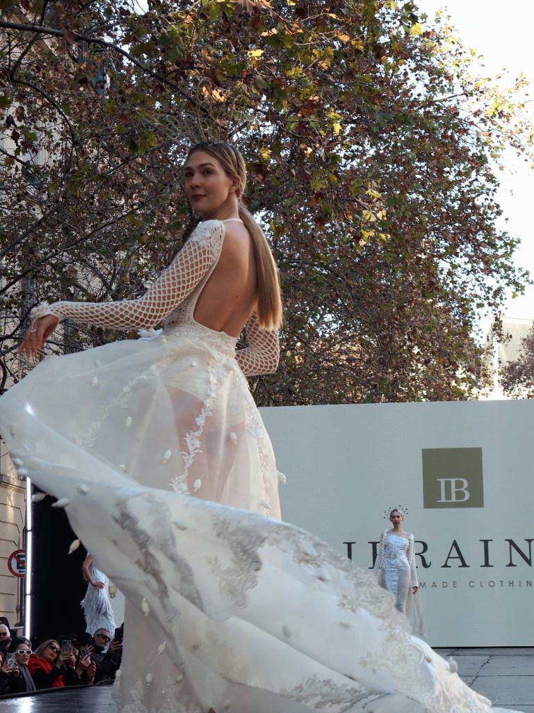 Ibraina, la marca de ropa hecha a mano, cerró la pasarela con sus atuendos monocromáticos en blanco. Connota su ADN de marca a través de flecos, encajes, transparencias, trenzados y tejidos.
