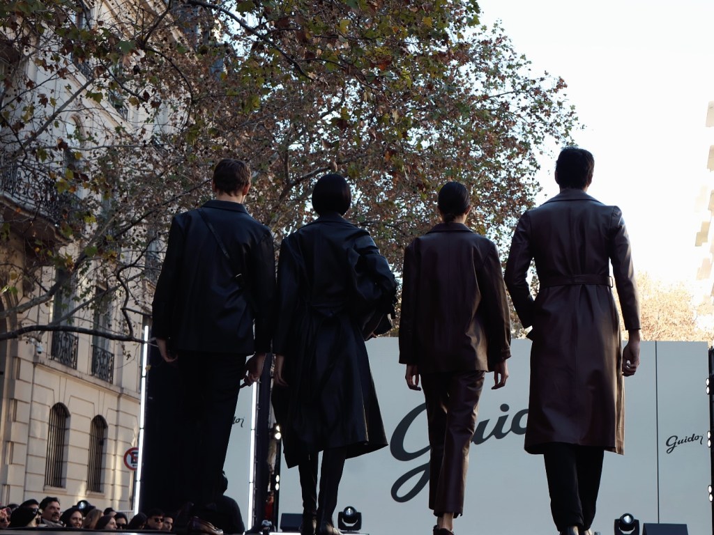 Guido, la marca que empezó la fabricación de calzados hechos a mano con un grupo de artesanos italianos en 1952, mezcló su esencia, es decir, el cuero junto a piezas de sastrería. Presentó cuatro atuendos en negro casi en su totalidad. “Cada creación es un testimonio del manejo artesanal del cuero argentino, seleccionado y tratado con la máxima precisión y dedicación”, asegura la página web oficial.