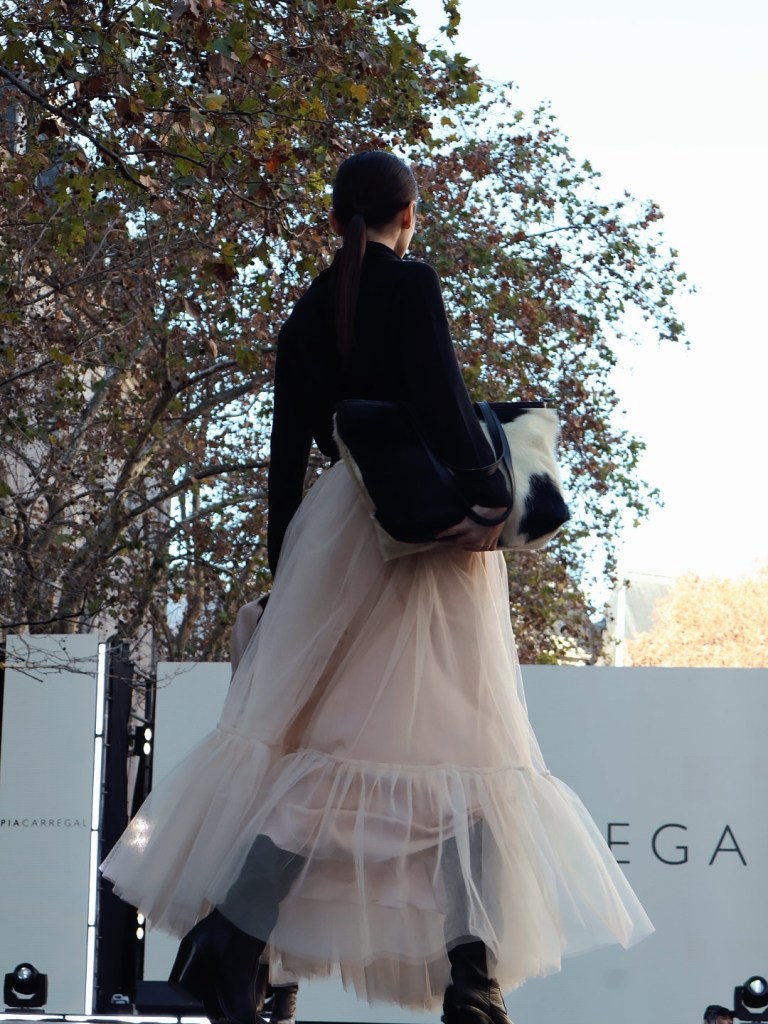 Pía Carregal inauguró la pasarela con la indumentaria en blanco y negro. La marca que abarca prendas hechas a mano en un modo de slow fashion, utilizó variedad de texturas como el encaje, el trenzado, el tul y el cuero. Jugó con el volumen de la tela y las siluetas.